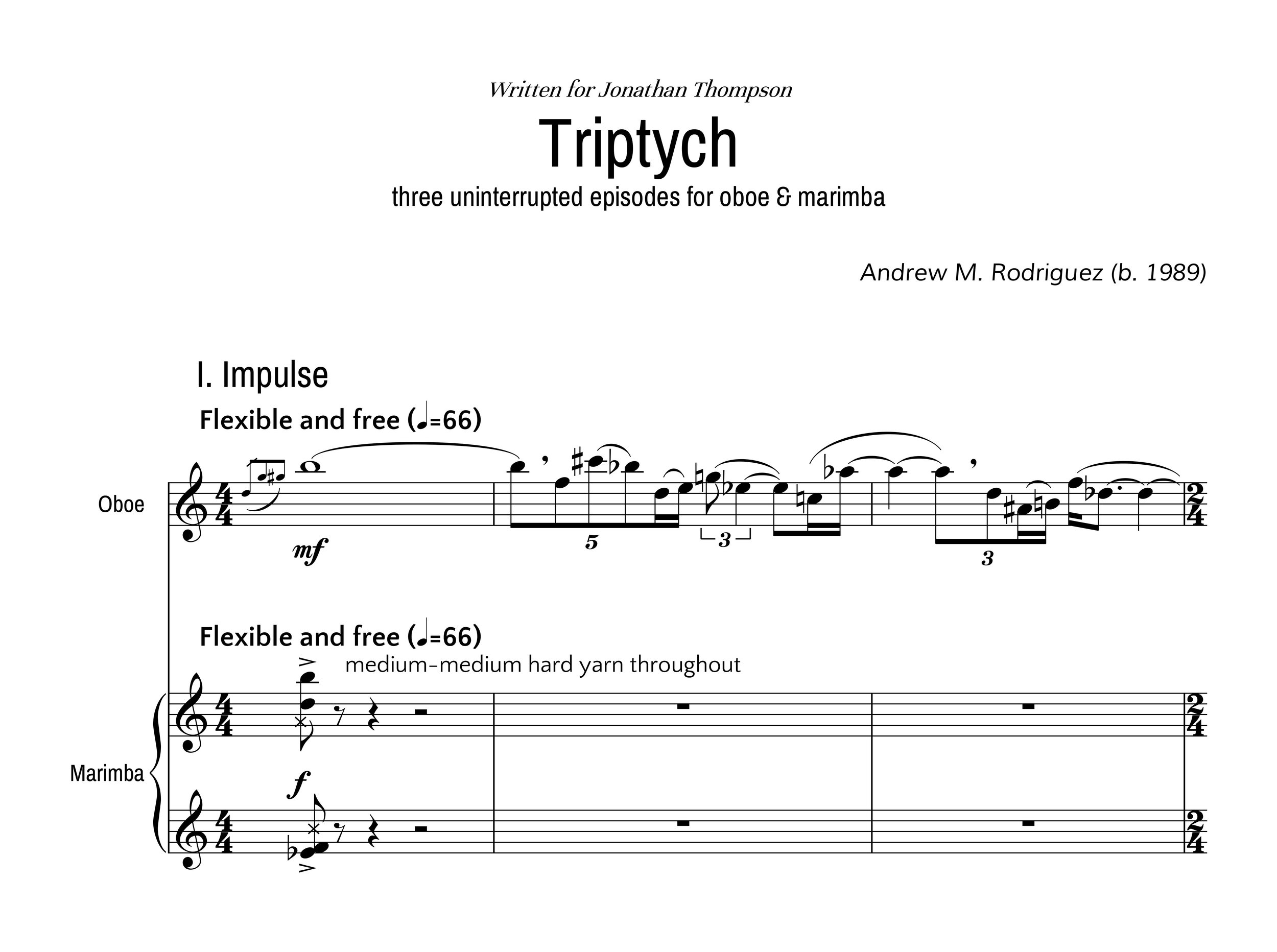 If I’m going to be honest, this piece kicked my ass. But then again, pretty much every piece I write kicks my ass. This one just kicked my ass repeatedly until I virtually had no ass left to get kicked. I didn’t want to write anything that resembled an oboe sonata. I didn’t want to treat the marimba as a keyboard and just rewrite the Poulenc sonata. I struggled to find ways to blend these two extremely different timbres and have them react to one another on the same level, rather than have an accompaniment with a melody. I worked a lot with creating different timbres between the two instruments, while also attempting to write for the performers’ strengths. The idea to write “three uninterrupted episodes” came about because I had pages on pages of sketches for this piece that didn’t exactly go together. While, they didn’t necessarily fit side-by-side, they also weren’t entirely alien to one another. I noticed that every new idea had grown out of a small motive from a previous idea. I just kept taking my favorite parts of each sketch and building new ideas that evolved into their own structure. The final episode, “Growth”, was one of the first sketches I worked on in detail. There are ideas in this episode that helped me create the first episode, which in turn helped to create the second episode. So in the end, the piece takes on a cyclical form that could be repeated ad infinitum.