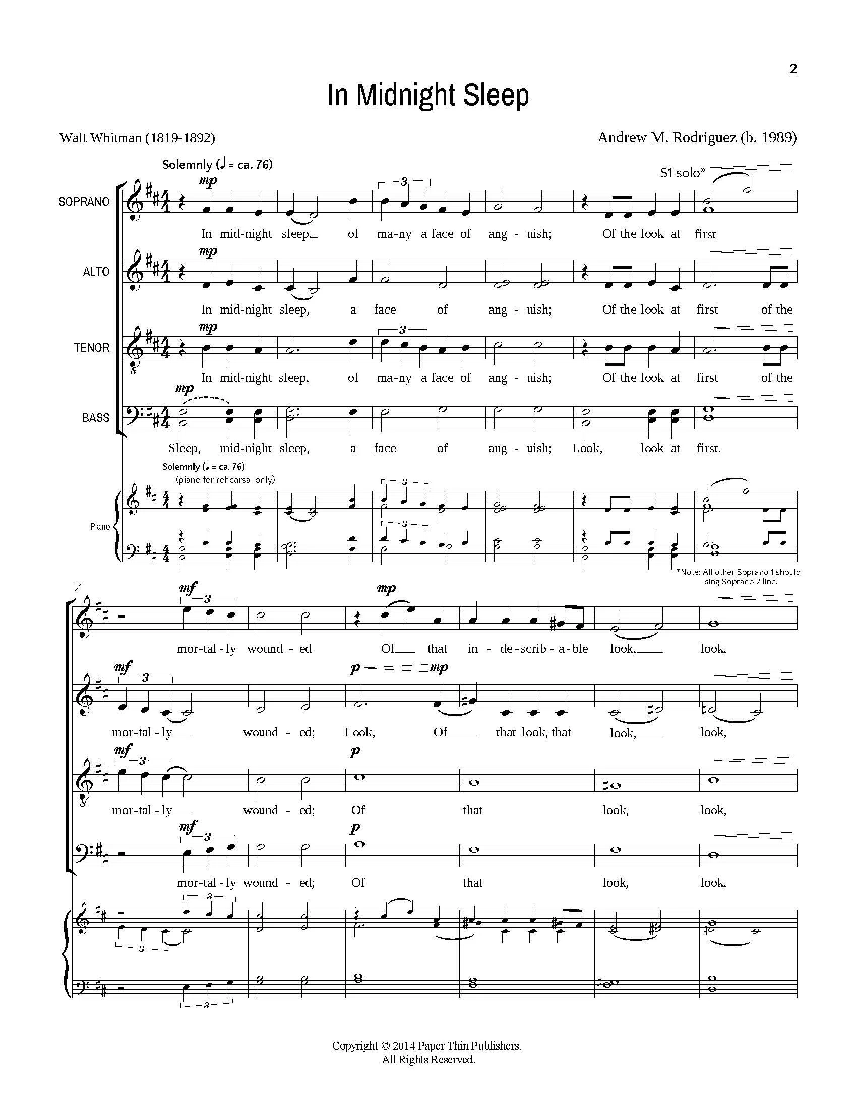 Walt Whitman's poem, "In Midnight Sleep," left a mark in the back of my mind from the time I first came across it many years ago. I had always desired to set the text to music, but it never quite came out right. In 2014, a series of events occurred regarding police brutality and the subsequent deaths of civilians. These events caused many protests and a violent uproar from this nation's people. Riots erupted across the country and it seemed as if our society was being ripped apart at the seams. Whitman had the misfortune of witnessing the seams come apart in his own time. Having served as a volunteer nurse during the American Civil War, this poem is a reflection of his thoughts and what he saw during a period of unrest. While my mind was troubled with the events surrounding Ferguson and Eric Garner, this text came back to me as if it were a vision. In this vision, I saw people that I knew and loved waging war against one another. Senseless violence surrounded me, and it was then that this poem truly spoke to me.
